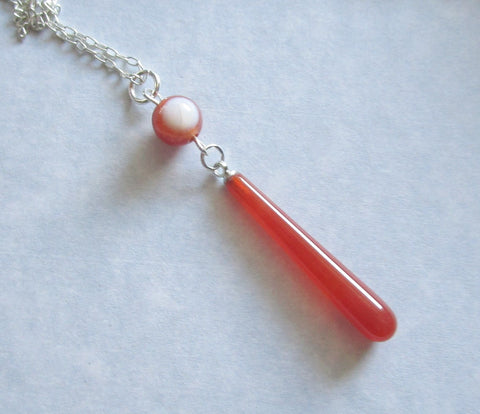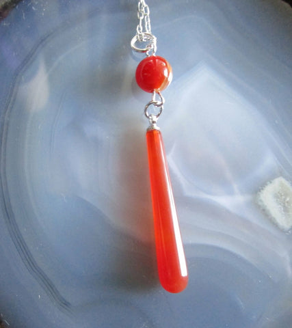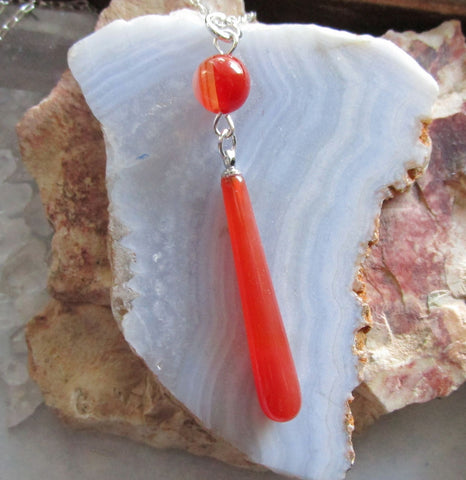I added a banded carnelian 8mm bead to the bail of a natural polished carnelian teardrop crystal. This comes with a 20 inch silver filled chain. The pendant is approximately 2 inches long. The carnelian drop has natural inclusions.