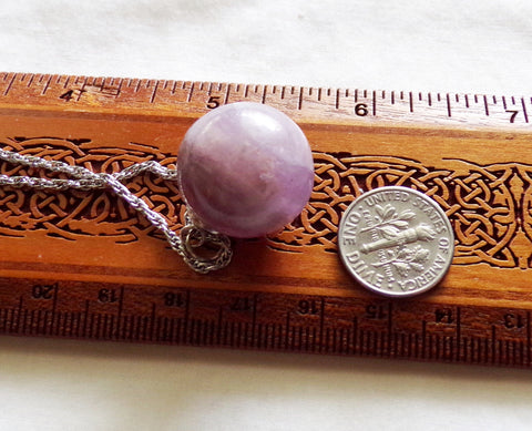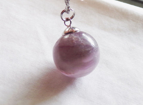 A banded rainbow fluorite crystal ball in shades of purple and lavender. It has natural inclusions and bands of color. This comes with a 24 inch silver filled chain. The sphere is approximately 20mm in diameter. It shows a slight color change between purple and blue shades, depending on the light source. Can be worn as a pendant or used as a pendulum.