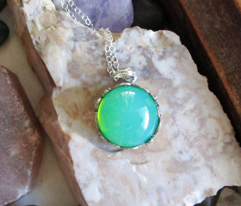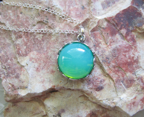 I set a vintage vaseline glass ultraviolet cabochon in a silver floral bezel setting. This comes with an 18 inch sterling silver chain. The glass cabochon is 15mm in diameter. It fluoresces bright green under ultraviolet light.