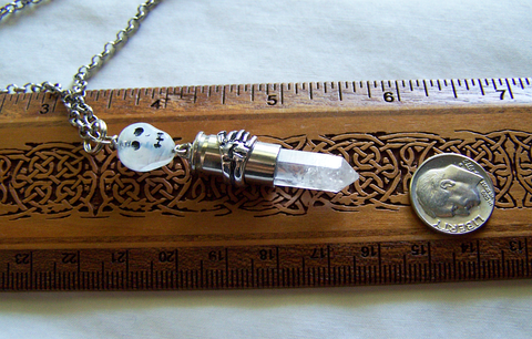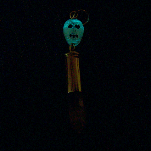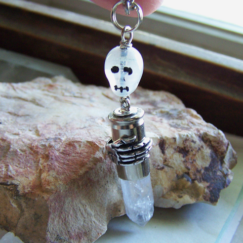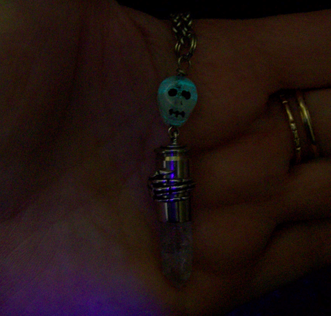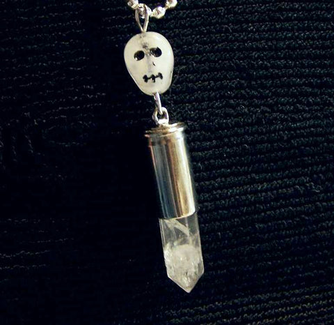 I attached a glow in the dark glass skull bead to a recycled 32 caliber silver bullet shell casing. I added a natural phantom quartz crystal point and a silver skeleton hand to the shell casing. This comes with a 24 inch oxidized silver chain. The skull glows in the dark and also under black light.