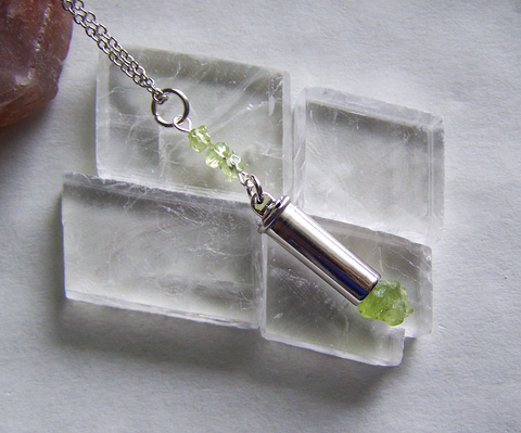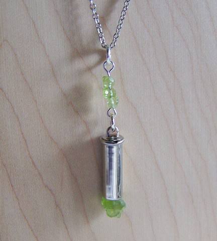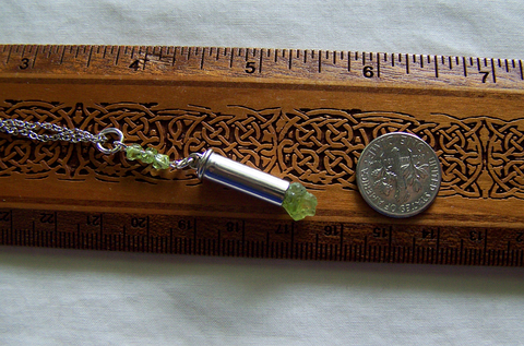 A recycled 22 caliber silver bullet shell casing combined with a natural green peridot raw gemstone. I added tiny peridot stone beads to the bail. This comes with a 24 inch silver filled chain.