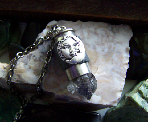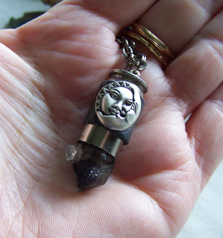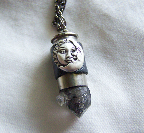I wrapped a recycled 45 caliber silver bullet shell casing with vintage black leather and added a black phantom elestial quartz crystal point. I attached an oxidized sun and moon face to the shell casing. This comes with a 24 inch textured gunmetal chain. The quartz has geometric shaped record keepers.