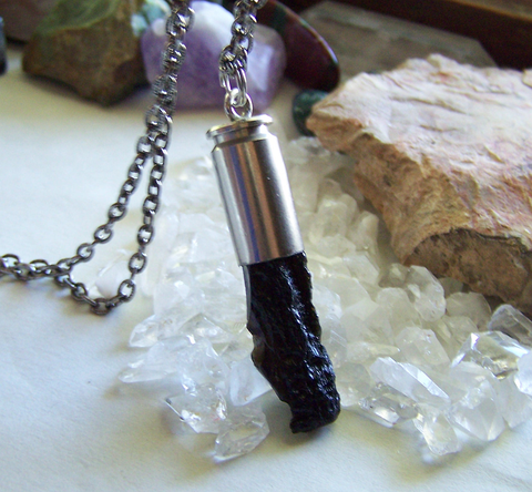 A recycled 40 caliber silver bullet shell casing combined with a natural black tektite crystal. This comes with a 24 inch textured gunmetal chain.
