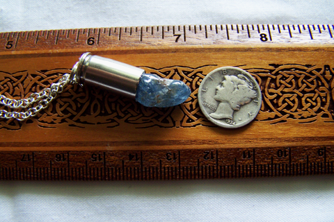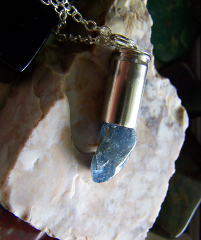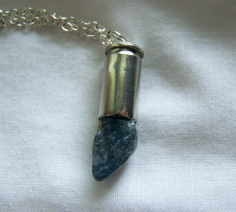 A recycled 32 caliber silver bullet shell casing combined with natural blue quartz polished rough stone. This comes with a 24 inch silver filled chain.