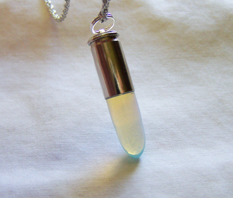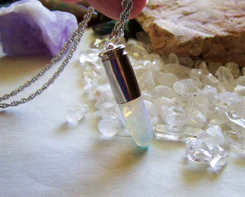 A recycled 32 caliber silver bullet shell casing combined with an iridescent opalite crystal bullet point. This comes with a 24 inch silver plated rope chain.