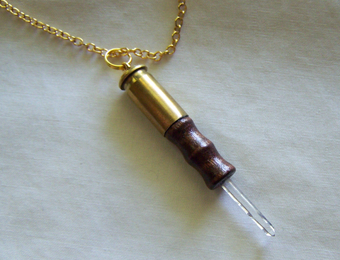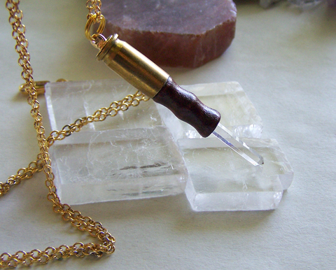 A recycled 25 caliber brass bullet shell casing combined with a tiny quartz mini wand. The wand comes with a boxwood handle, and the quartz point has a tiny record keeper geometric shape. A powerful combination of wand and bullet that any wizard might appreciate, for spell casting on the go. This comes with a 24 inch gold plated chain.