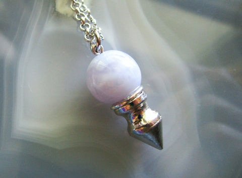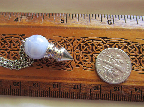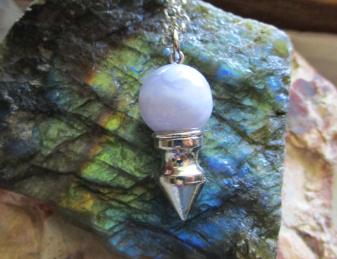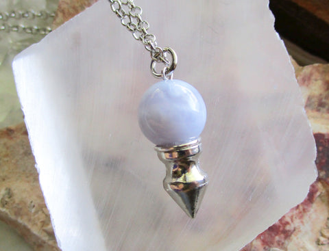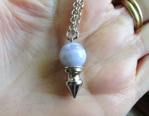 I attached a silver chrome spike to a 12mm natural blue lace agate bead. This comes with a 24 inch silver filled chain. Can be worn as a pendant or used as a pendulum. The sky blue agate has a scalloped lace pattern.