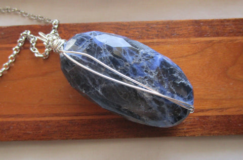 I wrapped a large natural blue and white sodalite polished faceted gemstone with silver filled wired. The pendant is approximately 2 inches long and comes with a 24 inch silver filled chain. Sodalite is a beautiful deep royal blue and usually contains white or grayish inclusions of calcite. The name sodalite reflects its sodium content.