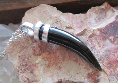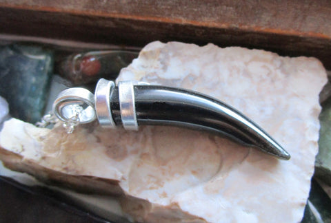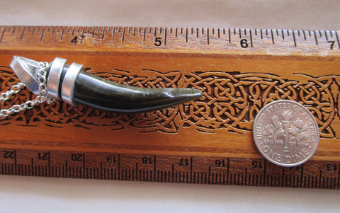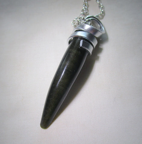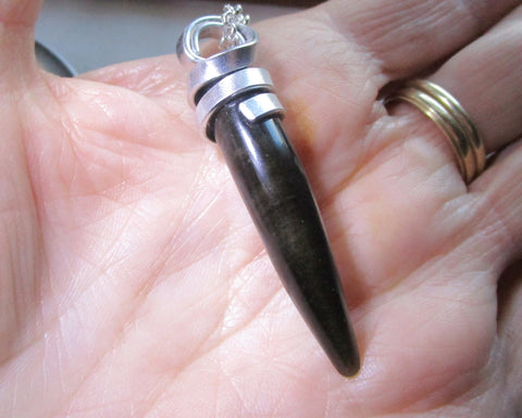 I wrapped a natural black and golden sheen obsidian gemstone crystal horn with flat silver aluminum wire. It has display of gold flash under light. This comes with a 24 inch silver filled chain. It can be worn as a pendant or used as a pendulum. The pendant is approximately 2 inches long. It has a small divot at the tip and I have reduced the price to reflect that.