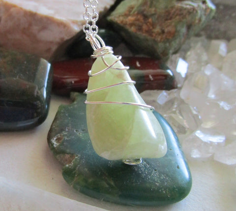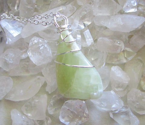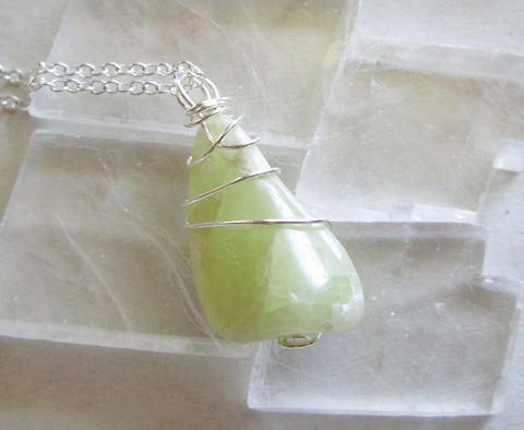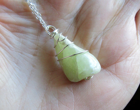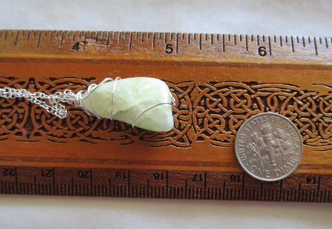 A natural heliodor polished gemstone wrapped with sterling silver wire. This comes with a 24 inch silver filled chain. The crystal is pale greenish yellow in color and is from New Hampshire.
