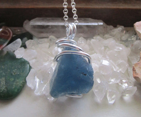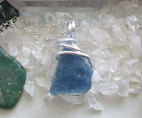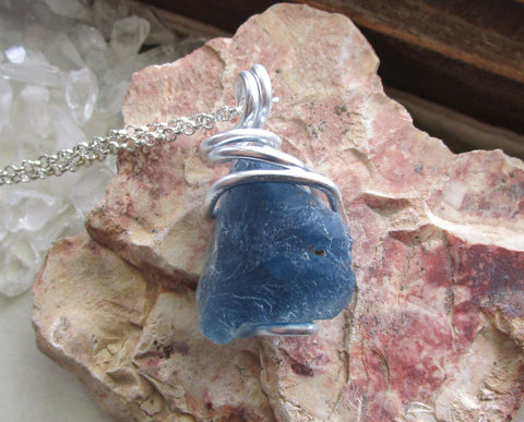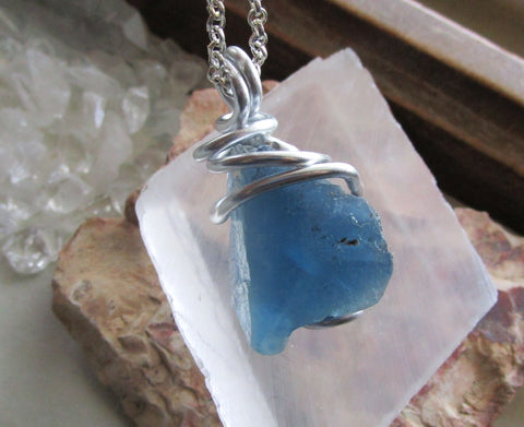 I wrapped a natural raw blue fluorite gemstone crystal with silver aluminum wire. This comes with a 24 inch silver plated chain. This fluorite is from Bingham in Socorro County, New Mexico. The color changes from teal blue to cornflower blue to indigo blue, depending on the light source. This is natural raw stone that has not been treated or polished in any way. It shows bands of color on the edges and has rainbow prism on one side.