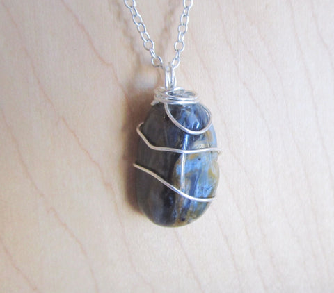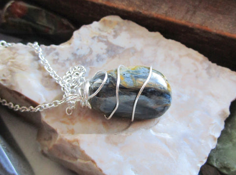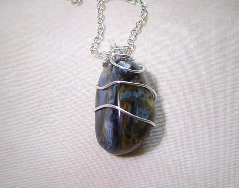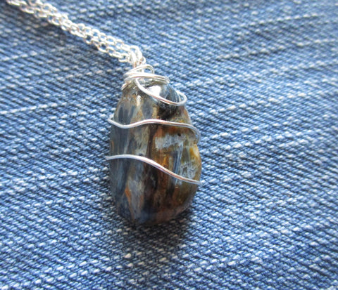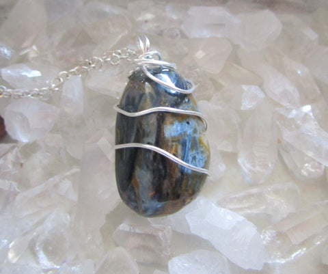 I wrapped a natural polished pietersite crystal with 925 sterling silver wire. This comes with a 24 inch silver filled chain. The pietersite has a beautiful pattern of blue and gold, with flashes of chatoyancy. It is approximately 21x14mm.