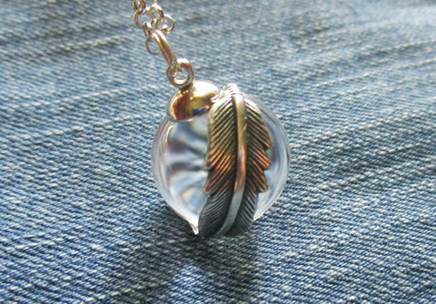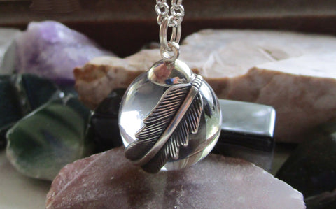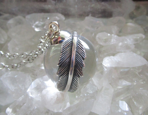 I wrapped an oxidized silver feather stamping around a natural quartz crystal ball. This comes with a 24 inch antiqued silver plated chain. The crystal ball is water clear and is approximately 18mm in diameter.
