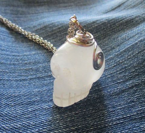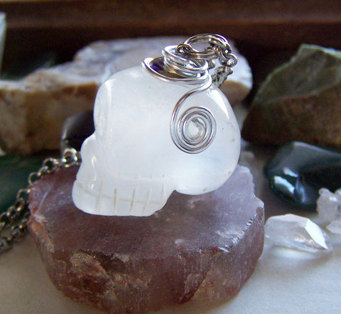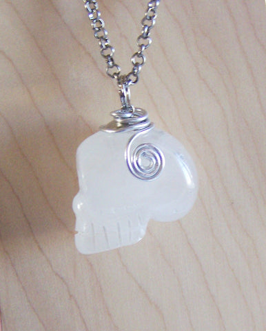 I capped a natural quartz crystal skull with a silver plated cap and added silver wire wrap trim. This comes with a 24 inch oxidized silver plated chain. The quartz has natural inclusions.