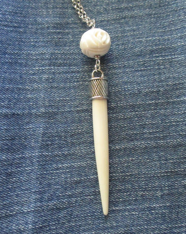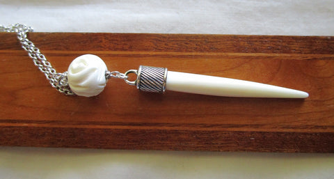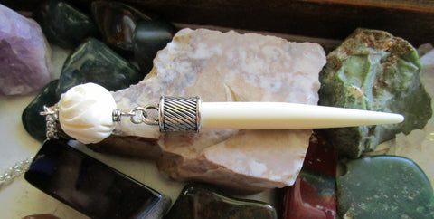 I added a silver alloy cap to an organic white bone tapered point and attached it to a hand carved natural white buffalo bone rose bead. This comes with a 24 inch silver filled chain. The pendant is approximately 3.5 inches long and the rose bead is 16mm in diameter. Can be worn as a pendant, used as a pendulum, or even as a mini wand.