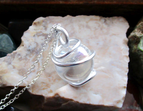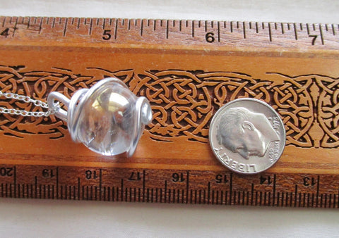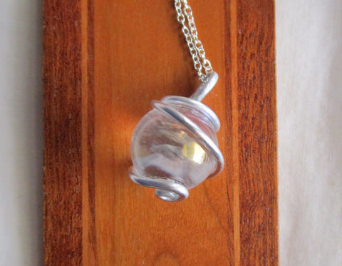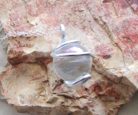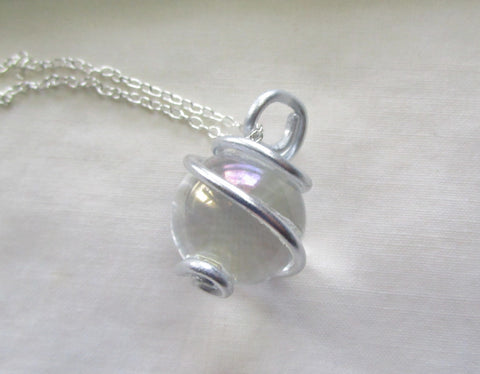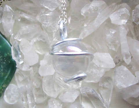 An aura quartz crystal ball wrapped with silver aluminum wire. This comes with a 24 inch silver filled chain. The quartz has natural inclusions and is approximately 15mm in diameter.