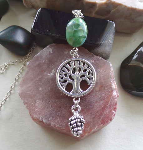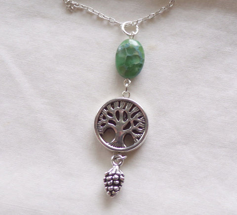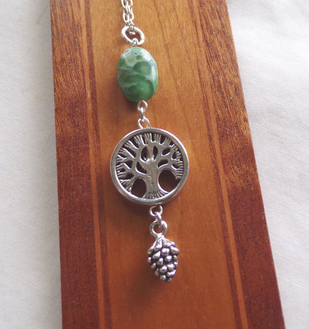 I combined a silver alloy tree of life bead with a polished green variscite oval gemstone bead, and added a silver alloy pine cone charm. This comes with a 24 inch silver filled chain.