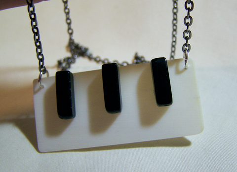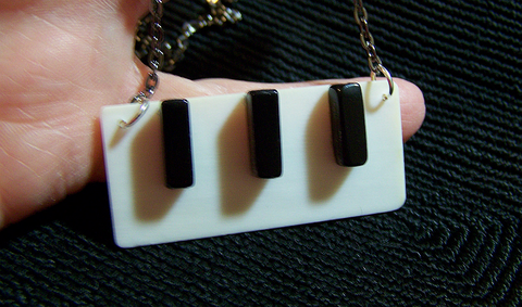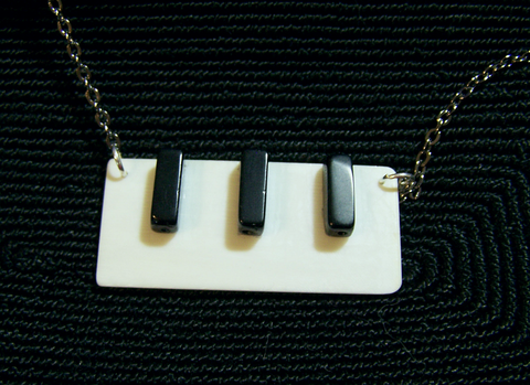I have used a vintage piano key veneer and attached black onyx rectangle beads to make the pendant look like tiny piano keys. This comes with a dark silver curb chain. Necklace is 20 inches in length. A great gift for a musician or music student.