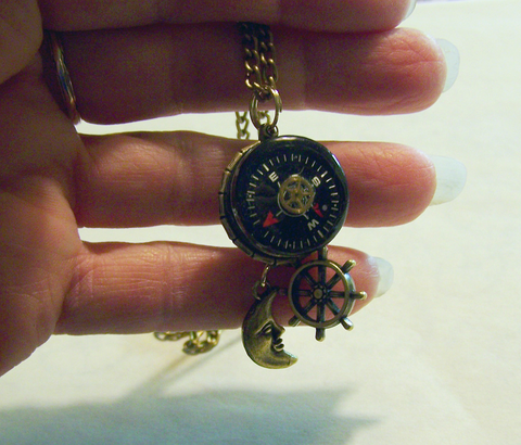 I attached a small brass watch gear to a compass and then placed it in a brass setting with a bamboo pattern. I added a brass ship's wheel and a man in the moon charm. This comes with a 24 inch brass chain. A great little nautical piece to guide you through your Steampunk journey.